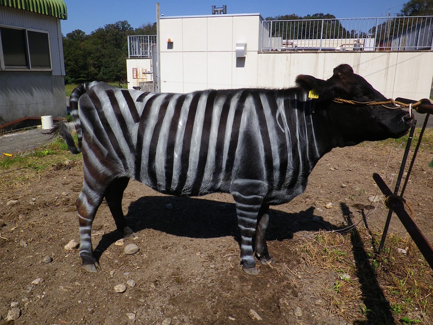 一方、サシバエやアブといった吸血昆虫は家畜生産性を低下させ、牛伝染性リンパ腫といった疾病を媒介する害虫で、世界中で家畜生産に多大な損害を与えています。本研究では、吸血昆虫忌避機能仮説を黒毛和種に応用し、シマ模様をウシに施すことにより、ウシの体表に付着する吸血昆虫数が減少し、その結果ウシが行う吸血昆虫忌避行動も減少するという仮説を立て、検証しました。